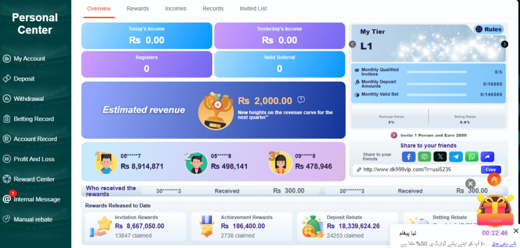 Withdrawing your earnings from the DK999 App is simple and quick :