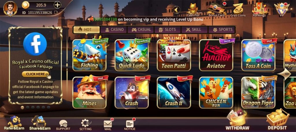Brace yourself for an amazing real money app experience with Royal X Casino in Pakistan, the ultimate home of all casino games. With a small investment get the chance to win big and earn more. Moreover, the stunning visuals of the game make it a treat to the human eyes. Get the application now from our website and embark on a journey of unlimited money. If you like this kind of app, you must also try your luck with the S9 Game APK, it also provides similar features and there is also a high chance of winning.